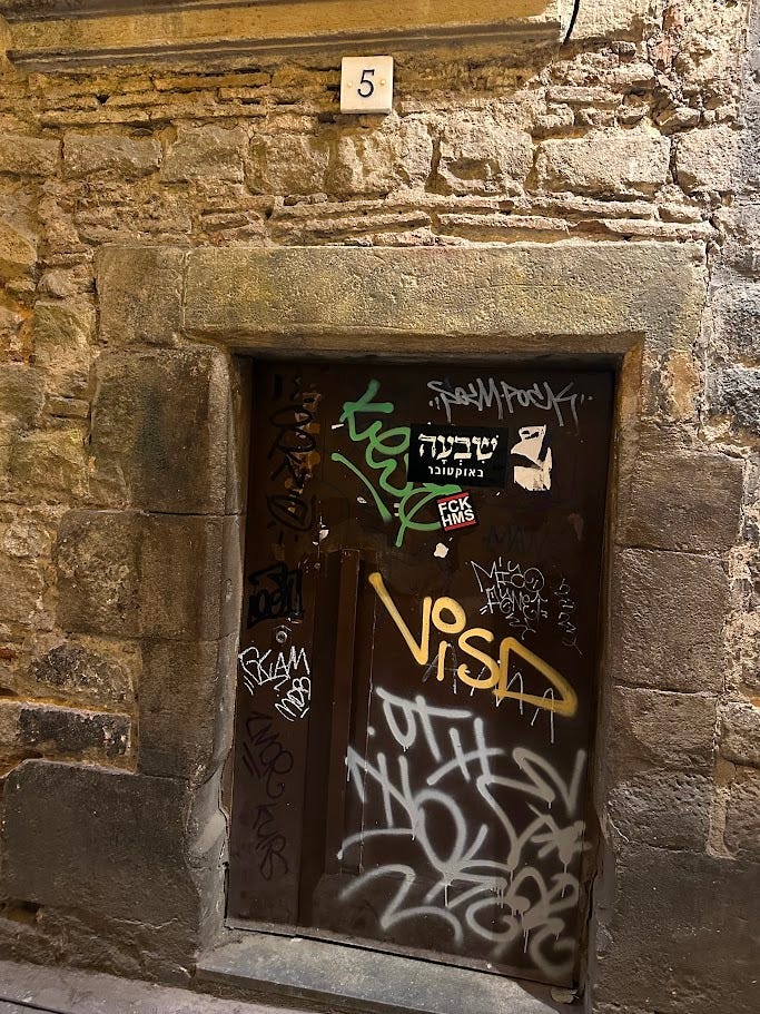 It turns out that my expectations were overly high. The area of the Gothic Quarter we entered was packed with tourists and souvenir shops. After walking through the crowded areas, we did arrive at quieter parts of the neighborhood, but I didn’t expect to see so much graffiti, especially on the door of what was at one time a synagogue in the Jewish Quarter (also known as El Call). The synagogue is open for tours, but unfortunately not at the time that we were in the city so we weren’t able to go inside.