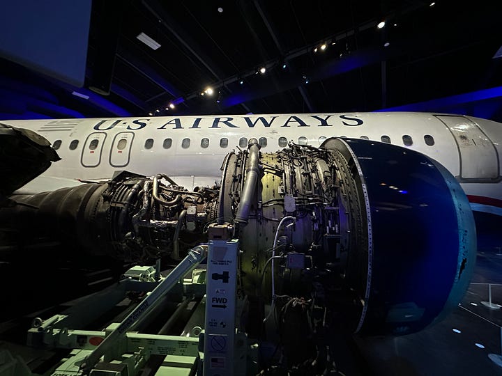 In case you don’t recognize the name, the museum’s namesake is Captain Chelsey “Sully” Sullenberger, the pilot known for the “Miracle on the Hudson.” After birds disabled both engines of Airways Flight 1549 on Jan. 15, 2009, Sully safely landed the plane into the Hudson River and all passengers survived. (Actor Tom Hanks portrayed the pilot in the film, “Sully.”) Since I both remember when that happened and saw the movie, I was especially intrigued with seeing that exhibit, which included the actual plane – and the destroyed engine.